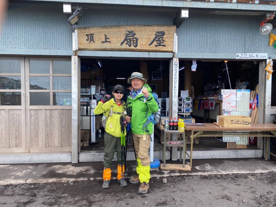 そして、今回2度目の挑戦。降雨の予報もありましたが、何とか曇り空の下、朝7時半に5合目を出発しました。気圧慣らしのために待機していた休憩所で隣り合わせになった大阪弁の小学生姉妹(小6と小4くらい)も父親に連れられ、私たちの後から登頂を開始したようでした。順調に7合目をクリアしたものの、徐々に休憩の回数が多くなり、8合目の山小屋で休んでいたところ、遂に大阪姉妹に追いつかれてしまいました。先に出発したのに追いつかれたことで息子が意識し始めたのか、その後、休憩で追いつかれる度に出発を急ぐようになりました。しかし、9合目を過ぎた辺りで遂に大阪姉妹は私たちの先を行くようになり、瞬く間に置いて行かれるようになり、そのまま頂上まで先にゴールされてしまいました。何とか大阪姉妹に遅れること数十分、私たちも13時半に頂上に到達することができました。3年前より2時間も短縮できたものの、大阪姉妹に逆転を許したことがよほど悔しかったのか、息子は浮かない顔をしながら、山田さん(新宿営業所)が働く山小屋でラーメンをすすっていました。何とか息子の無念を晴らすため、箱根駅伝に例え、往路では確かに大阪姉妹に負けてしまったけど、復路で逆転できれば総合優勝やと息子を鼓舞したところ、俄然やる気を取り戻しました。