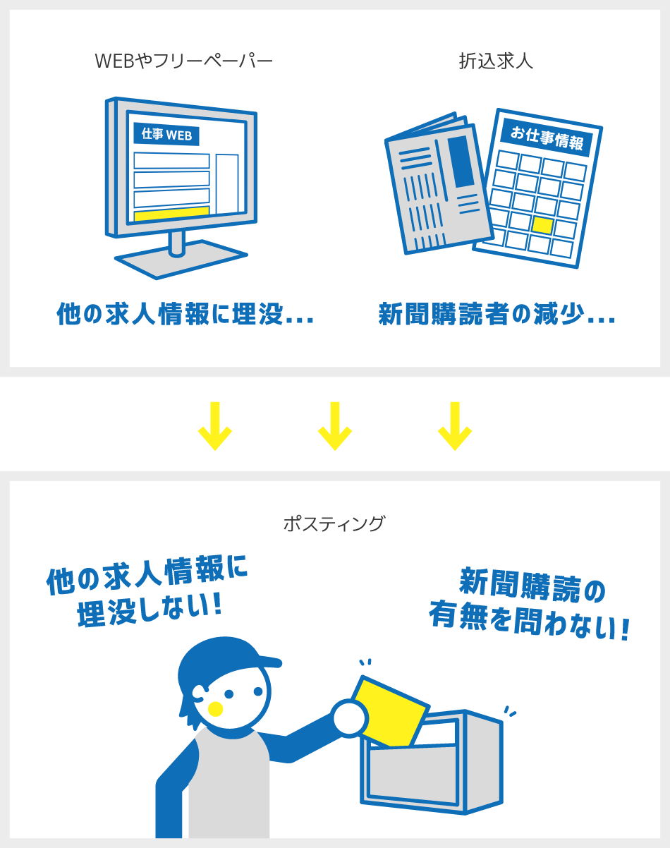 ひと昔前であれば、折込求人で採用できていたのが、新聞購読者の減少に伴い、ポスティングによる求人にとって代わられたと言えるでしょう。